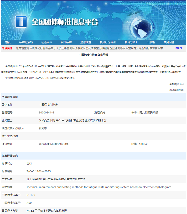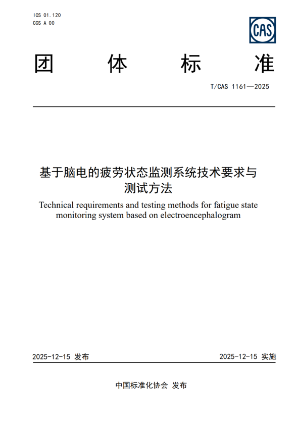 T/CAS 1161—2025《基于脑电的疲劳状态监测系统技术要求与测试方法》团体标准全国团体标准信息平台链接:https://www.ttbz.org.cn/StandardManage/Detail/158119/
