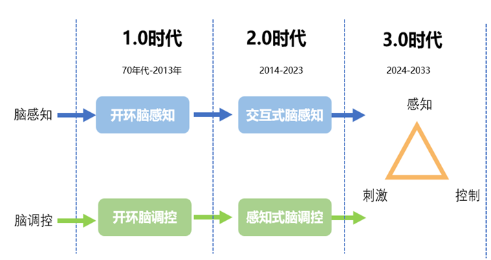 3. 总结提炼脑机接口技术发展特点和趋势,提出两横三纵发展规律。报告根据脑机接口技术发展规律,将多国从2013年开始相继实施的脑计划作为里程碑,将脑机接口技术发展划分为脑计划前期(1.0阶段)、中期(2.0阶段)和后期(3.0阶段)三个阶段。1.0阶段的脑感知和脑调控技术开环独立发展,原则上并不属于脑机接口技术,但是其发展的极早期形态和基础。2.0阶段脑感知技术交互更加友好,脑调控技术演进为感知式。3.0阶段出现智能化趋势与融合趋势。智能化体现在信号采集与解码智能化,多模态融合与闭环控制智能化,实现自适应学习与个性化校准、产品智能化升级。融合是指多技术手段融合、功能融合和学科交叉融合。